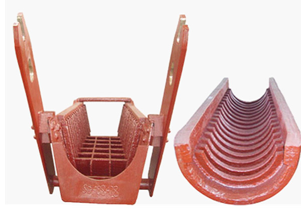 布料溜槽是高爐的核心工作部件,其使用壽命的高低直接影響到高爐的連續(xù)作業(yè)率和休風(fēng)檢修頻率。布料溜槽工作的環(huán)境溫度一般在300~400℃之間,異常情況可能出現(xiàn)600℃以上高溫,工況條件十分苛刻。布料溜槽通過中心喉管接受爐頂來料,再通過旋轉(zhuǎn)和角度調(diào)整控制,將爐料均布于爐膛完成冶煉過程。中心喉管出口到溜槽落料點(diǎn)有一段落差,爐料通過落料點(diǎn)后,其方向和速度都會(huì)發(fā)生改變,產(chǎn)生一部分能量轉(zhuǎn)換。由于爐料粒度較小,單一顆粒的能量傳遞亦較小,因此,我們將這里的磨損形式定義為沖刷,沖刷的磨損機(jī)制是小能量鑿削,因此落料點(diǎn)處磨損極為強(qiáng)烈。落料點(diǎn)以下的磨損形式則是常規(guī)意義上的磨粒磨損,磨損機(jī)制是犁削。但由于過料量大,磨損亦十分強(qiáng)烈。